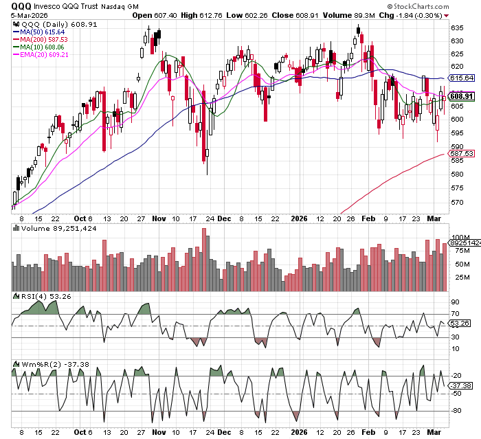 Markets did close way off the lows yesterday, but a daily chart of the QQQ still shows a choppy market going nowhere. Would expect this continues until we get some resolution, and relief on oil prices…..
