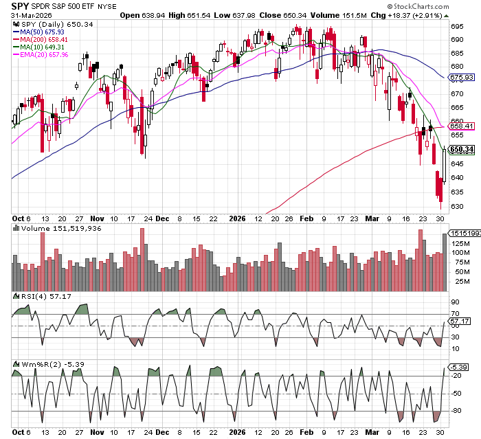 Iran’s President came out yesterday and said his country has the necessary will to end the war. That, plus quarter end, was enough for an almost 3% rally. So far this morning more green in stocks and red in oil.