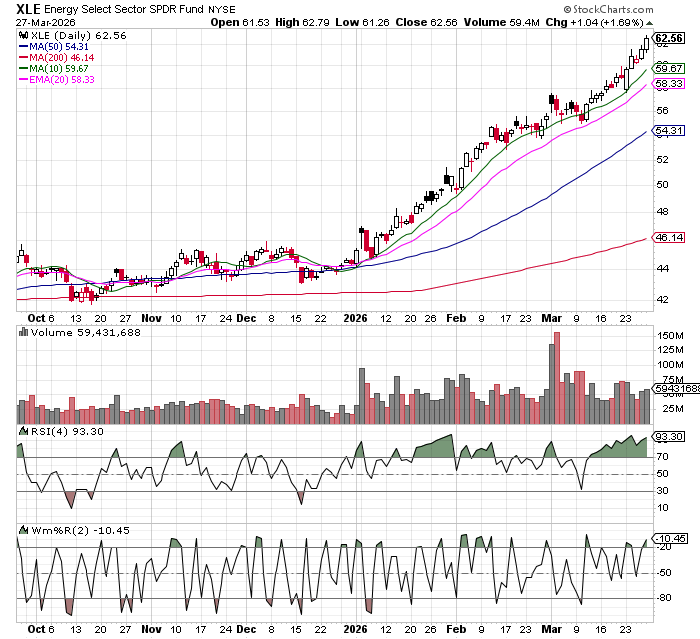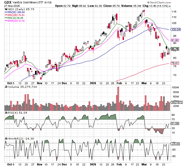 Gold and silver miners were the strength on Friday. Still like them here, but any long term disruption to oil prices will impact their bottom line. May eventually need to shift to the actual metals if this continues…..