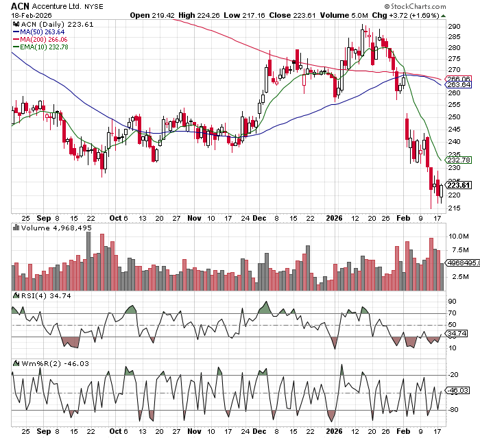 Accenture (ACN) — ACN is a “picks-and-shovels” way to own the enterprise AI rollout without having to pick the winning model or application layer. The market’s AI debate has moved from “cool demos” to “show me the ROI,” and that’s exactly where ACN’s wheelhouse lives: modernizing data stacks, migrating/optimizing cloud, securing identities and workflows, redesigning processes, and then operating the environment as managed services. In an agentic-AI world, complexity doesn’t disappear — it migrates into orchestration, governance, compliance, and integration across messy legacy systems, and those are high-friction problems that large enterprises still outsource. The bull case is that AI expands ACN’s addressable work (more transformation + more ongoing run/operate) while reinforcing vendor stickiness through multi-year programs. The bear case is also clear: if AI compresses implementation effort (coding productivity, commoditized integration), pricing power and billable hours can come under pressure, and ACN’s demand can be cyclical if CIO budgets get cautious. Net: I like ACN as an “old economy benefiting from AI” compounder when the market wants measurable productivity and execution capability—but I’d watch bookings momentum, utilization/pricing, and whether GenAI-led projects translate into durable managed-services revenue (not just one-time consulting bursts).